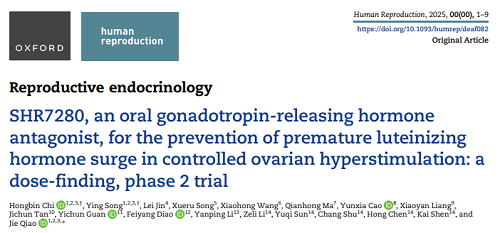 PG创新药口服GnRH拮抗剂SHR7280辅助生殖II期研究发表于Human Reproduction