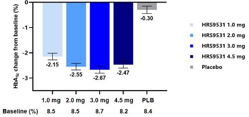 在HRS9531治疗期间,大多数治疗期间不良事件(TEAEs)为轻度或中度。未报告任何具有临床意义(<3 mmol/L)或严重的低血糖事件。整体安全性特征与其他GLP-1RA类药物相似。