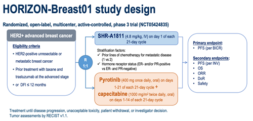 HORIZON-Breast01研究是随机对照、开放标签、多中心Ⅲ期试验(NCT05424835)。入组患者为晚期接受过曲妥珠单抗和紫杉烷,或曲妥珠单抗和紫杉烷新辅助/辅助治疗后12个月内进展的HER2阳性晚期乳腺癌。患者随机1:1接受瑞康曲妥珠单抗(4.8mg/kg,静脉注射,每21天给药一次)或吡咯替尼(400mg,口服,每天一次)联合卡培他滨(1000mg/m²,口服,每天两次,d1-d14,每21天为一个周期)治疗。分层因素为转移性阶段既往化疗线数(1 vs 2)以及激素受体状态(HR阳性 vs HR阴性)。依据RECIST v 1.1进行肿瘤疗效评估。主要研究终点是盲态独立评审委员会(BICR)评估的PFS。